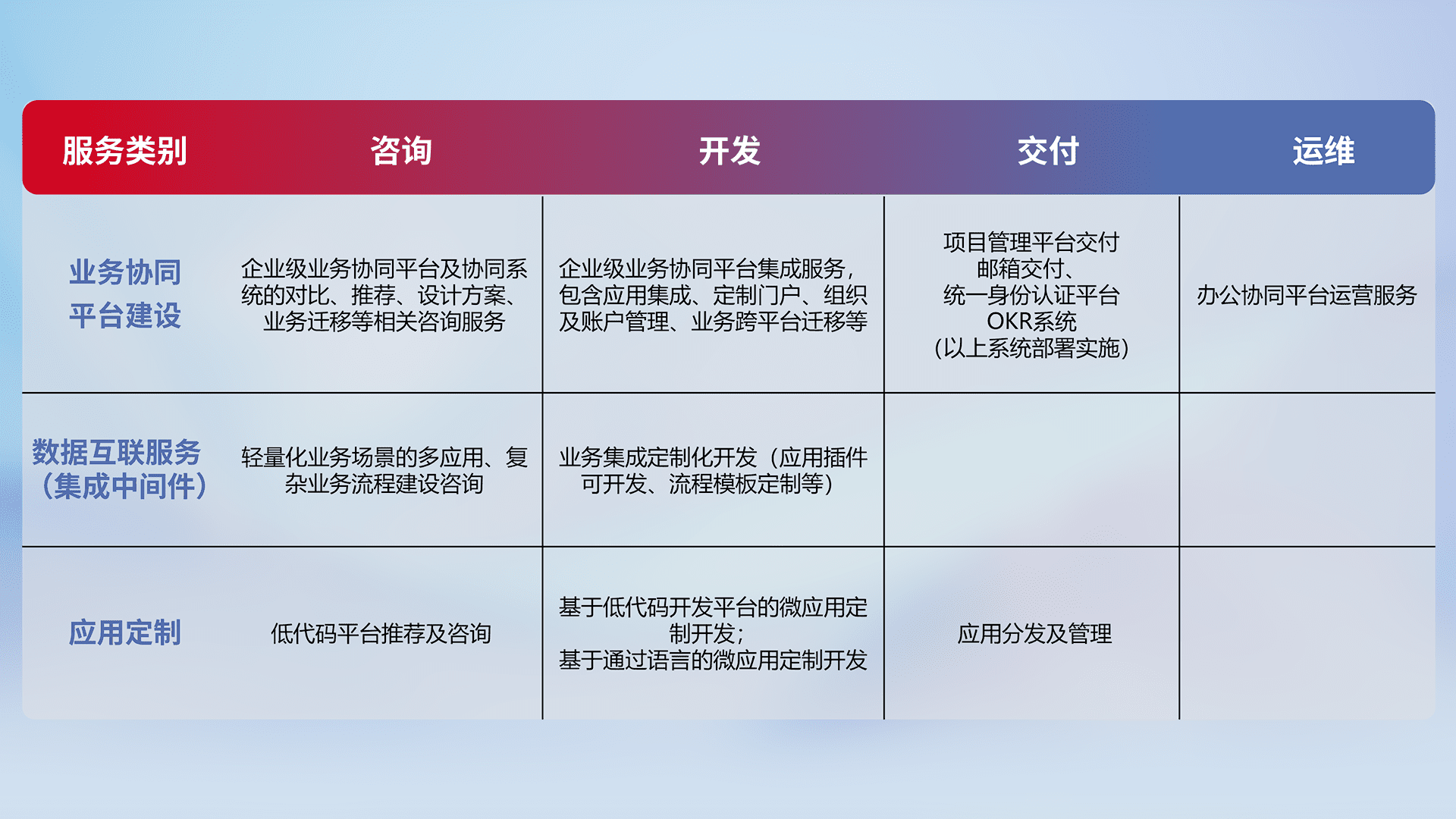 针对钉钉、、、、企微、、IDaas等平台级产品提供产品的规划、、、方案、、、交付、、、定制化开发等服务,,实现如统一协同办公、、、智能客户服务、、混合会议管理、、、、智能数据查询、、、等业务场景,,,,实现数字化转型。。。。