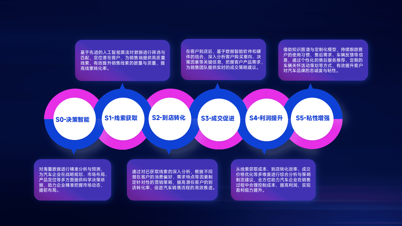 通过拓宽潜在客户来源、、、优化线索分配并提高到店转化率,,以增强销售效率。。同时,,,,利用线索数据不断优化分析模型,,有效提升转化率,,,,扩大营销影响力。。。